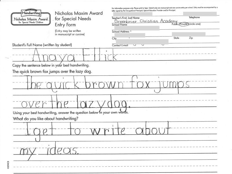 Nicholas Maxim, o estudante que dá nome ao concurso, coincidentemente não tinha as mãos e utilizava o braço para escrever, justamente como Anaya, de 9 anos. Talvez daqui algum tempo nós nos deparemos com um concurso chamado ‘Anaya Ellick para Excelência em Caligrafia Cursiva’!