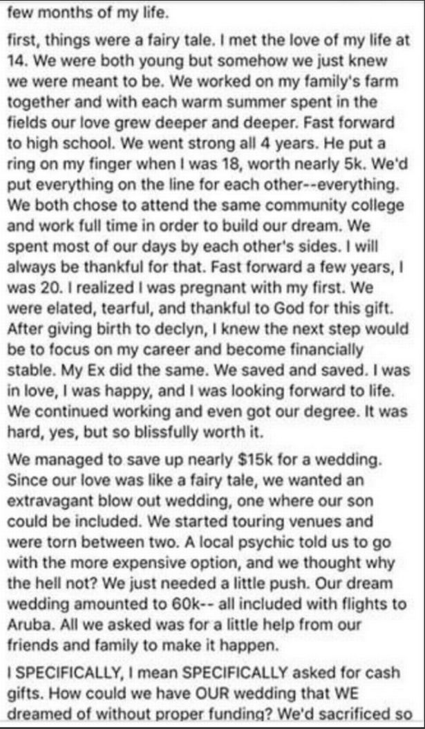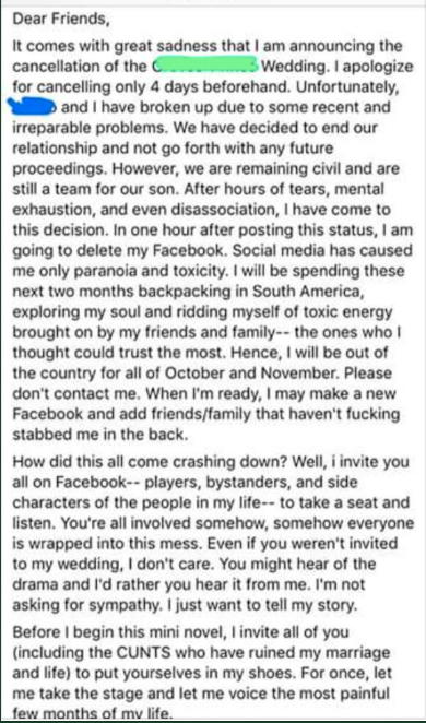 Como qualquer verdadeira geração do milênio, ela decidiu compartilhar uma postagem no Facebook para explicar por que o casamento havia sido cancelado e, felizmente para nós, alguém fez o screenshot da coisa toda e a compartilhou no Mumsnet.
