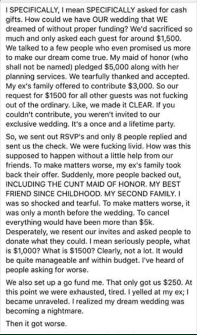 ”[…] e apenas pedimos para casa convidado em torno de US$1.500. Nós conversamos com algumas pessoas que até nos prometeram mais para realizar o nosso sonho. Minha dama de honra (que não será nomeada) prometeu US$5.