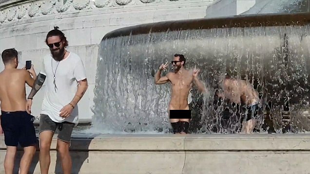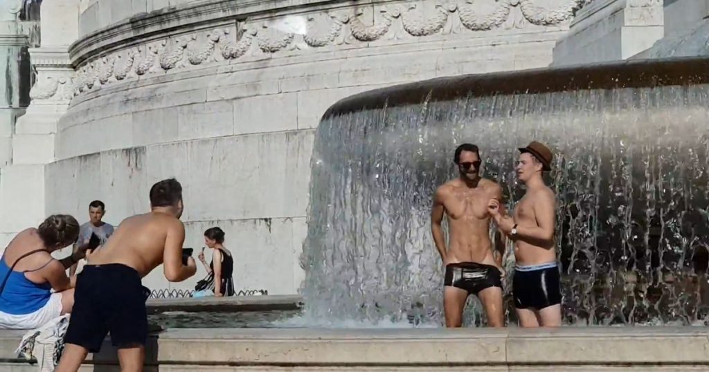 O par brincou sob a fonte, na Piazza Venezia, antes de abaixar as calças e posar para uma foto tirada por espectadores.