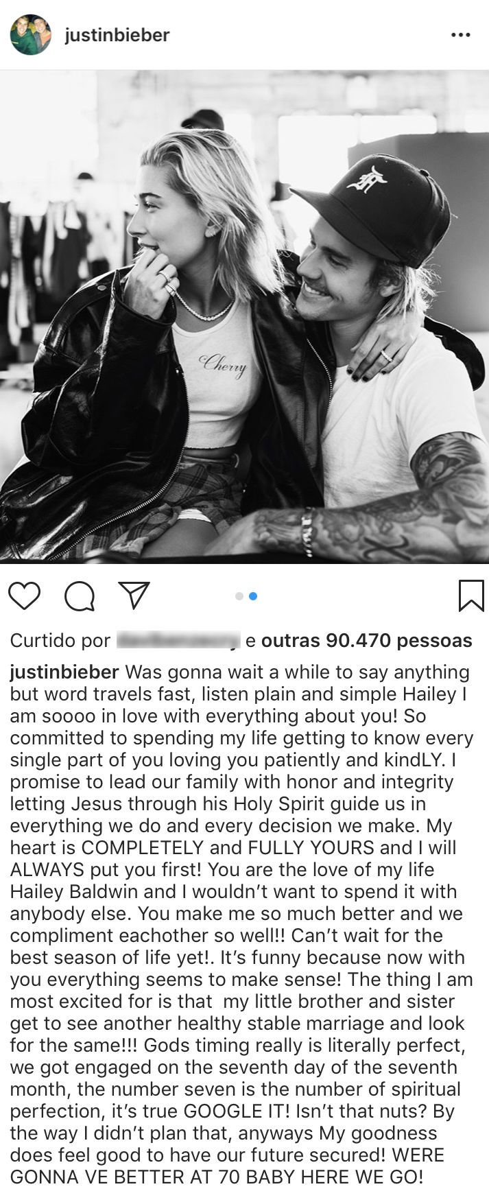 Tradução [parcial]: “Meu coração é COMPLETAMENTE seu e eu SEMPRE a colocarei em primeiro lugar. Você é o amor da minha vida, Hailey Baldwin, e eu não gostaria de passar o resto dela com nenhuma outra pessoa. Você me faz muito melhor. Nós completamos um ao outro tão bem! Mal posso esperar para ter a melhor temporada da nossa vida! É engraçado porque agora, com você, tudo parece fazer sentido”.