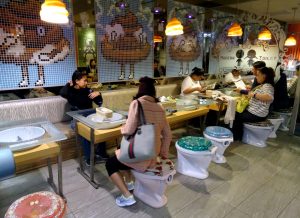 As paredes tem quadros de cocôs e as luminárias também são nesse formato nada convidativo. Para comer, você senta em privadas.