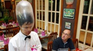 Os garçons também te servem bem no tema esquisitíssimo do restaurante! (Somos todos aquele homem ali muito confuso)