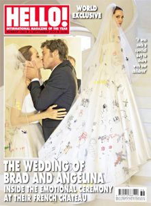 Quando se casou com Brad Pitt, Angelina usou um vestido com várias ilustrações feitas por seus filhos e a gente ficou aqui se perguntando por que ela achou que isso era uma boa ideia…