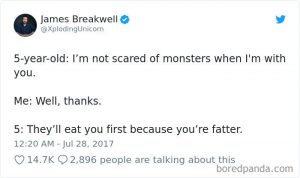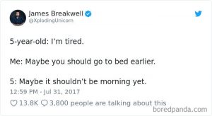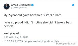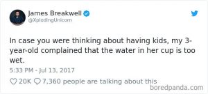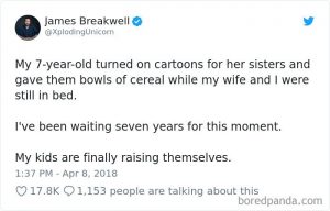 “Elas gostam do que eu faço no Twitter, principalmente porque é tudo sobre elas“, disse Breakwell ao Buzzfeed. “Por um lado, o Twitter me faz um pai melhor, porque eu passo mais tempo com meus filhos. Por outro lado, o Twitter me torna um pai muito pior, porque só faço isso para conseguir mais material“.