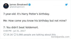 Filha de 7 anos: É o aniversário do Harry Potter.