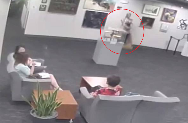 Na filmagem que foi capturada pela câmera de CCTV, a criança de 5 anos pode ser vista indo em direção à escultura chamada “Afrodite di Kansas City” enquanto sua mãe conversa com outras pessoas no sofá.