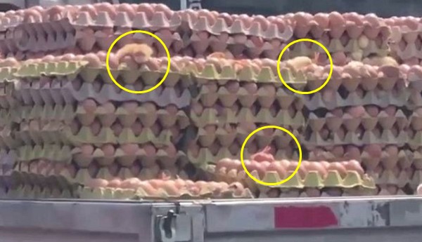 O vídeo continha um caminhão carregando ovos correndo na estrada.