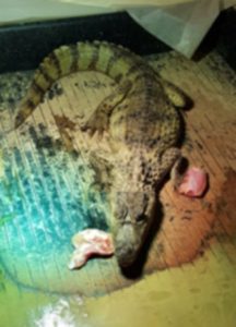 “Quando os policiais entraram na propriedade, ficaram extremamente chocados ao encontrar um crocodilo no quarto” disse Richard Walker. “Havia um cheiro avassalador de fezes e imediatamente alertamos a RSPCA“.