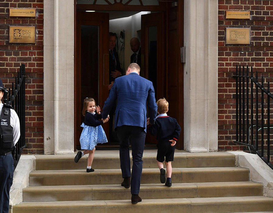 Mais tarde, o príncipe George e a princesa Charlotte chegaram para encontrar o seu novo irmãozinho. Um momento fofo muito fofo foi esse da foto, quando a princesa Charlotte acenou para a multidão que esperava do lado de fora do Hospital St Mary.