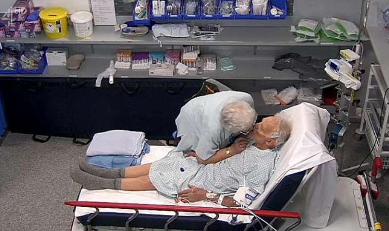 Ela inclinou-se para dar um beijo gentil no marido. As pessoas que viram o companheirismo da doce velhinha ficaram emocionados. Ela estava determinada a ficar ao lado do marido na cama do hospital.