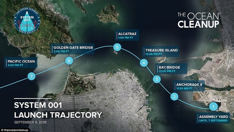 “No dia 8 de setembro, vamos lançar o primeiro sistema de limpeza oceânica do mundo de nosso pátio de montagem em Alameda, através da Baía de São Francisco, em direção à Grande Mancha de lixo do Oceano Pacífico”, revelaram os organizadores do projeto.