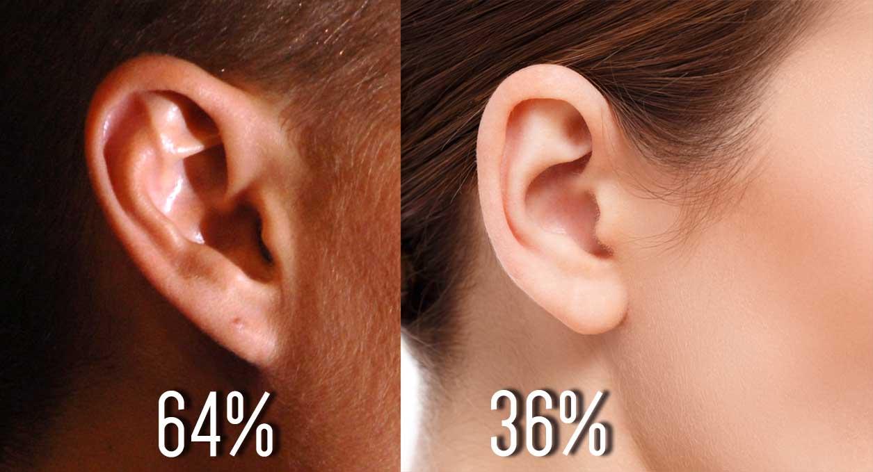 Estima-se que 64% das pessoas possuem as pontas (ou lóbulos) das orelhas anexadas ao rosto, enquanto nos outros 36% da população as orelhas são menos coladas.