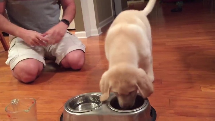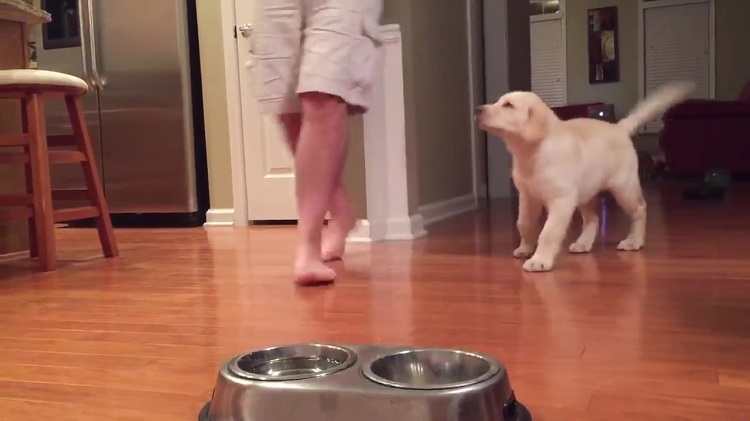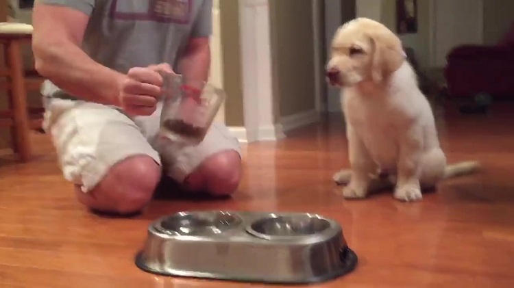 O vídeo começa com o cachorro abanando o rabo enquanto ele sabe o que está acontecendo. Seu dono está segurando um pote que contém sua ração, então sabe que é quase hora de comer.