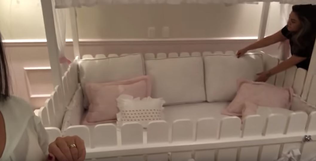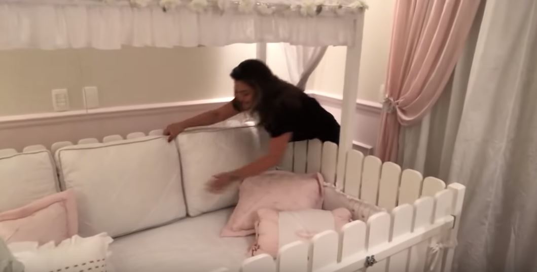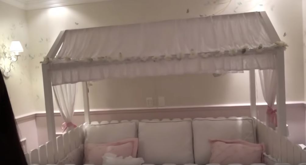 Logo no início do vídeo, a atriz chama atenção para a cama de sua filha, que é composta por uma grande estrutura que imita um cercadinho branco, um enorme colchão e um telhadinho forrado de tecido e decorado com flores que acendem. Uma verdadeira fofura!