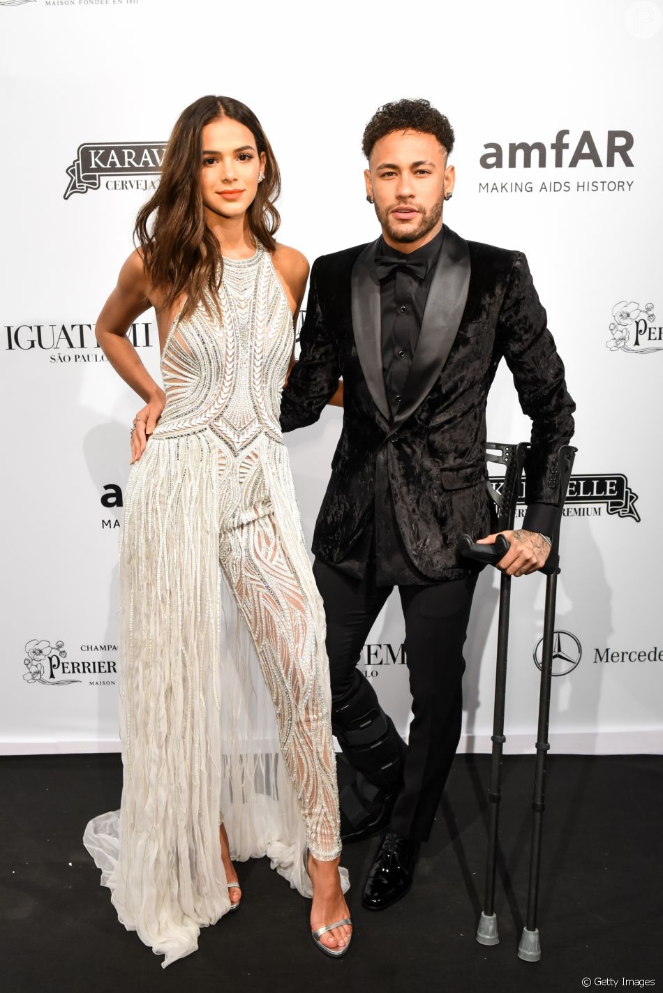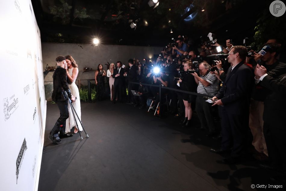 Primeiro ele chegou todo glamouroso com um terno de veludo e de muletas, acompanhado da namorada Bruna Marquezine, que usou um belíssimo conjunto branco.