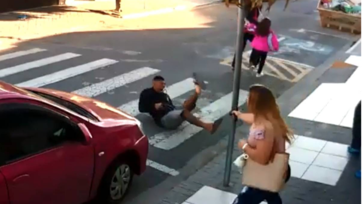 Nas imagens, um assaltante armado se aproxima de um grupo de mulheres e crianças que estavam na calçada em frente a uma escola.