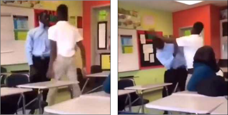 O que surpreende é que o professor joga o rapaz em uma mesa. Aparentemente, ele fez isso em reação ao estudante havia tentado lhe desferir um soco.